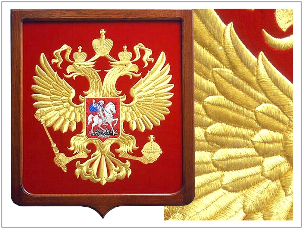 Мы предлагаем Герб РФ с вышивкой, размещенный в деревянной фигурной рамке, который может быть установлен на стену вашего кабинета, офиса или другого помещения.